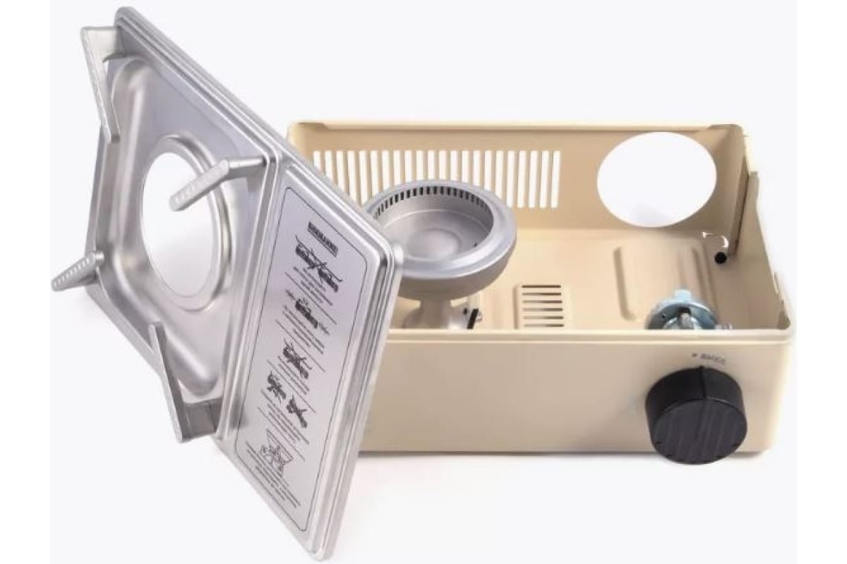 Плита оборудована одной горелкой с кольцевым образованием пламени, имеет пьезоэлектрический розжиг и блок управления подачи газа. Оборудованная магнитным клапаном(редуктором), в качестве топлива используются газовые смеси в баллонах с нажимным клапаном и цанговым захватом.