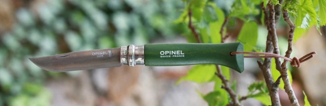 Клинок Опинель №8 по геометрии напоминает турецкие ятаганы – у него гладко заточенное лезвие и поднятое практически до линии обуха острие. Длина лезвия равна 85 мм. Клинок довольно тонкий – 1,5 мм и подойдет для точных аккуратных разрезов. В качестве материала лезвия, в Opinel №8 используется нержавеющая сталь. Это марка 12C27, которая производится по традиционным шведским технологиям. Такая сталь объединила в себе два важных свойства: коррозийную стойкость и твердость. Поэтому Опинель №8 как нельзя лучше подходит именно для полевого использования.